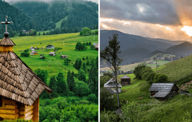 ![Українські туристичні села Ілюстративне фото українського села в горах]()