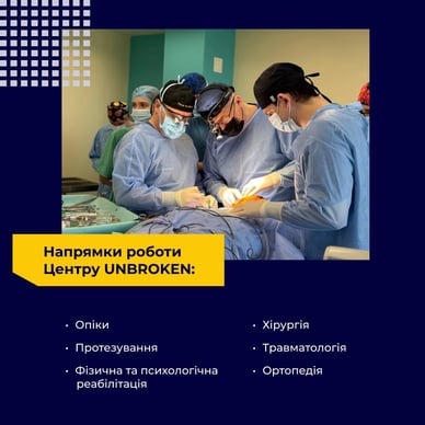 Національний реабілітаційний центр UNBROKEN об’єднує кілька ключових напрямів — від екстреної хірургії до психологічної реабілітації, що дозволяє пацієнтам проходити повне відновлення в одному місці.