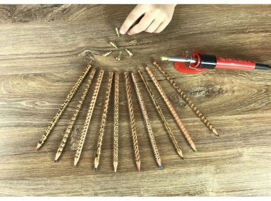 У комплекті шість насадок, якими пірографісти користуються найчастіше: універсальна (може застосовуватися також і як паяльник), точкова для делікатних робіт, довга для малювання ліній, зі скошеним наконечником для створення ефекту тіні, фігурна для візерунків, насадка-ніж для роботи з полімерними матеріалами.