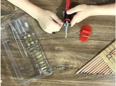 До того ж у наборі є дві фанерні заготовки, одна з яких — з уже нанесеним контуром. Усі деталі зручно зберігати в пеналі, що пропонується в комплекті. Цей пірограф можна купити онлайн із гарантією від магазину на 14 днів.